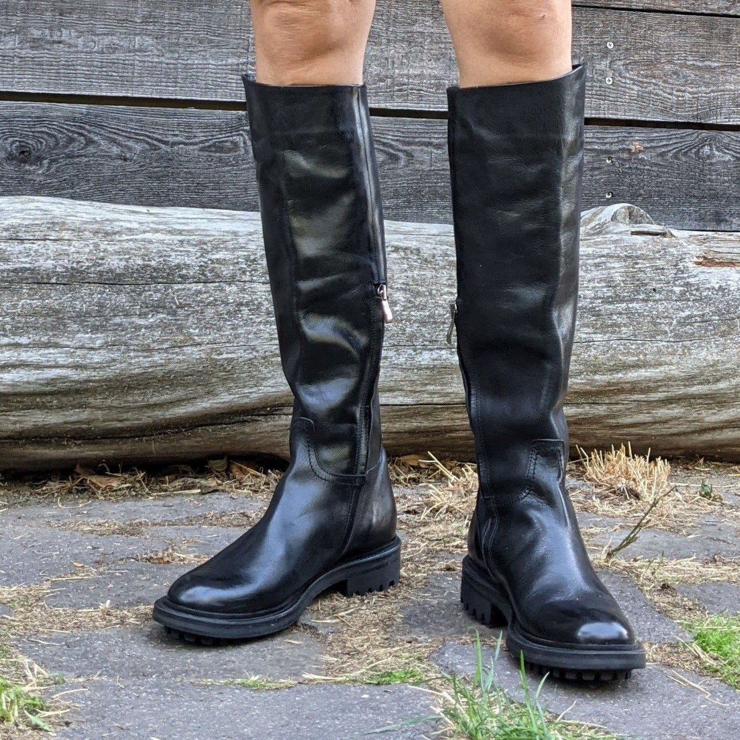 Stivali da donna al ginocchio con solida suola in gomma antiscivolo dalla silhouette arrotondata realizzati in pelle nero di vitello spazzolato e lucido.