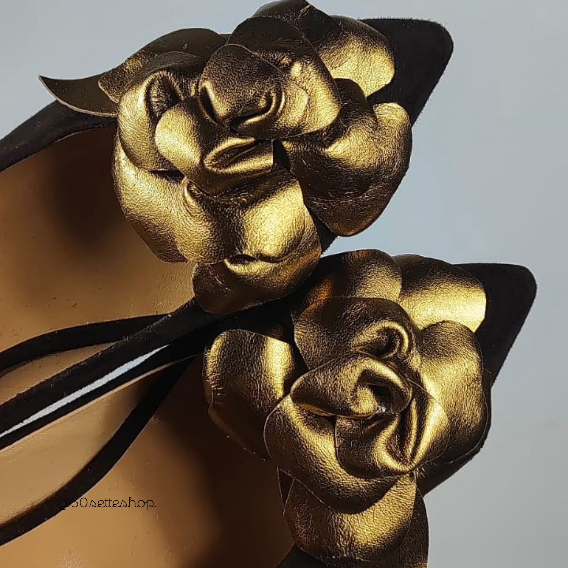 Dalia ballerina a punta con maxi fiore in nappa realizzata artigianalmente a mano in una delicata pelle scamosciata testa di moro e maxi fiore di dalia in laminato bronzo.