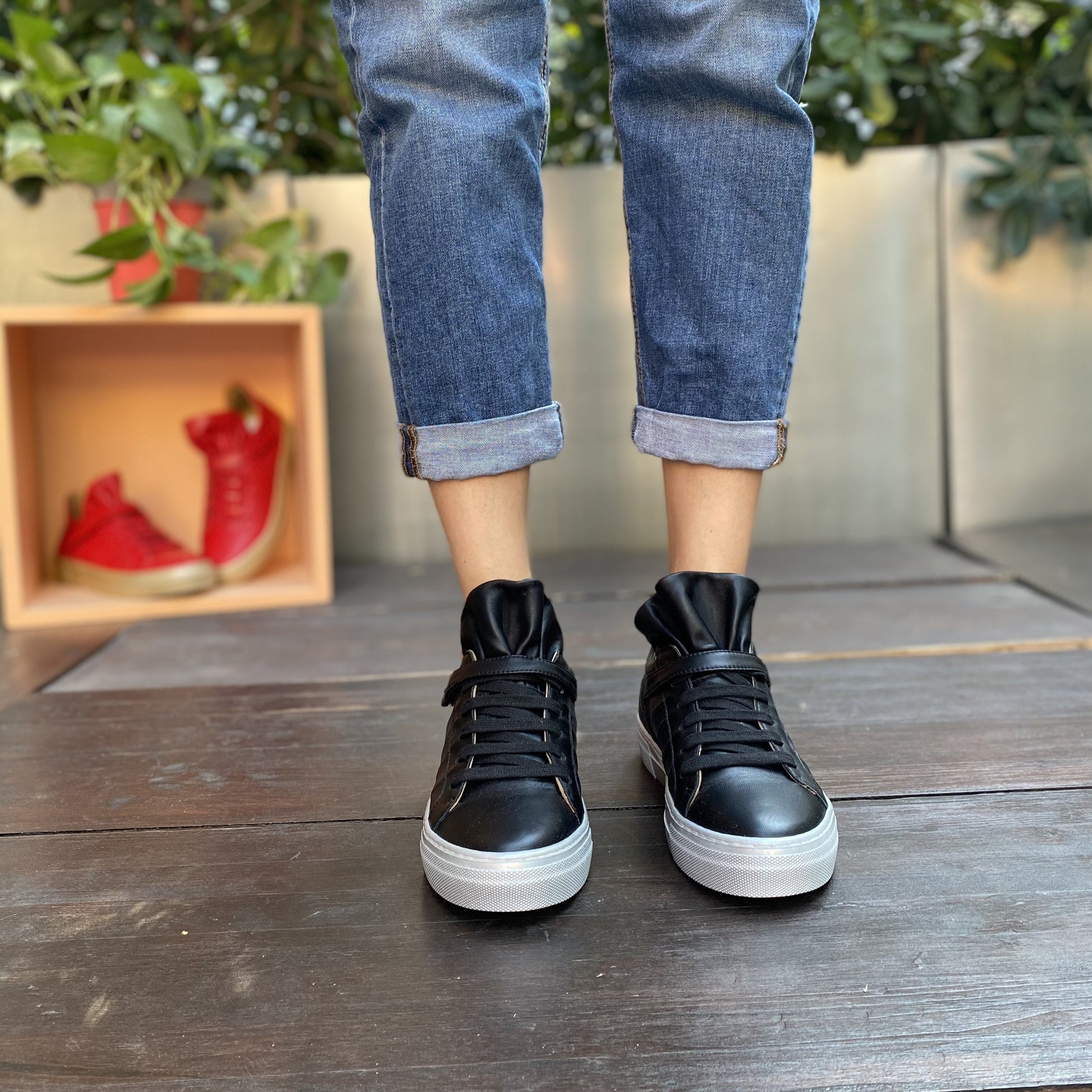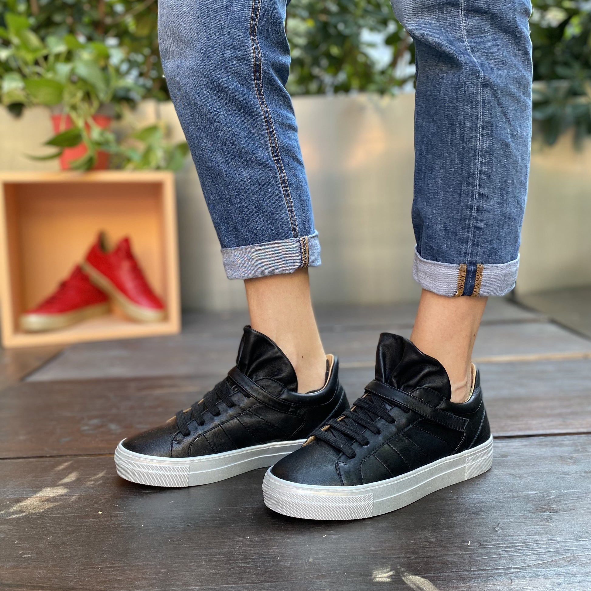 SNEAKERS ALLACCIATA IN MORBIDISSIMA NAPPA NERA CON LA LINGUETTA CHE TERMINA CON UNA MORBIDA ROUCHES SULLA CAVIGLIA. FONDO A CASSETTA IN GOMMA BIANCA DI 3 CM.