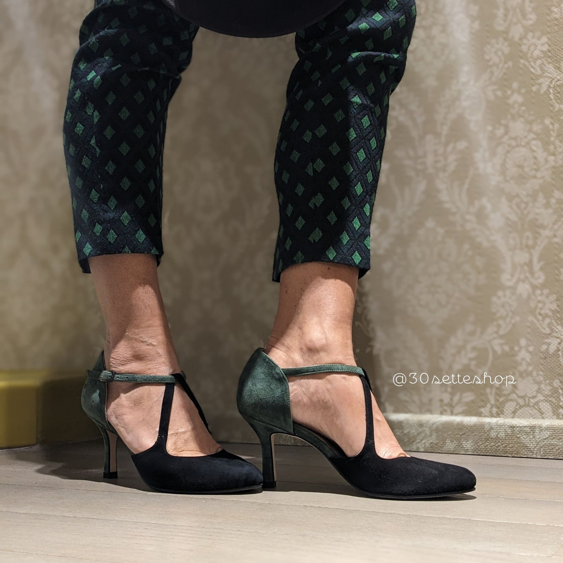 Isobel décolleté con tacco di media altezza e doppio cinturino t-bar realizzata artigianalmente in camoscio nero in punta e camoscio verde bosco nel tacco e tallone.