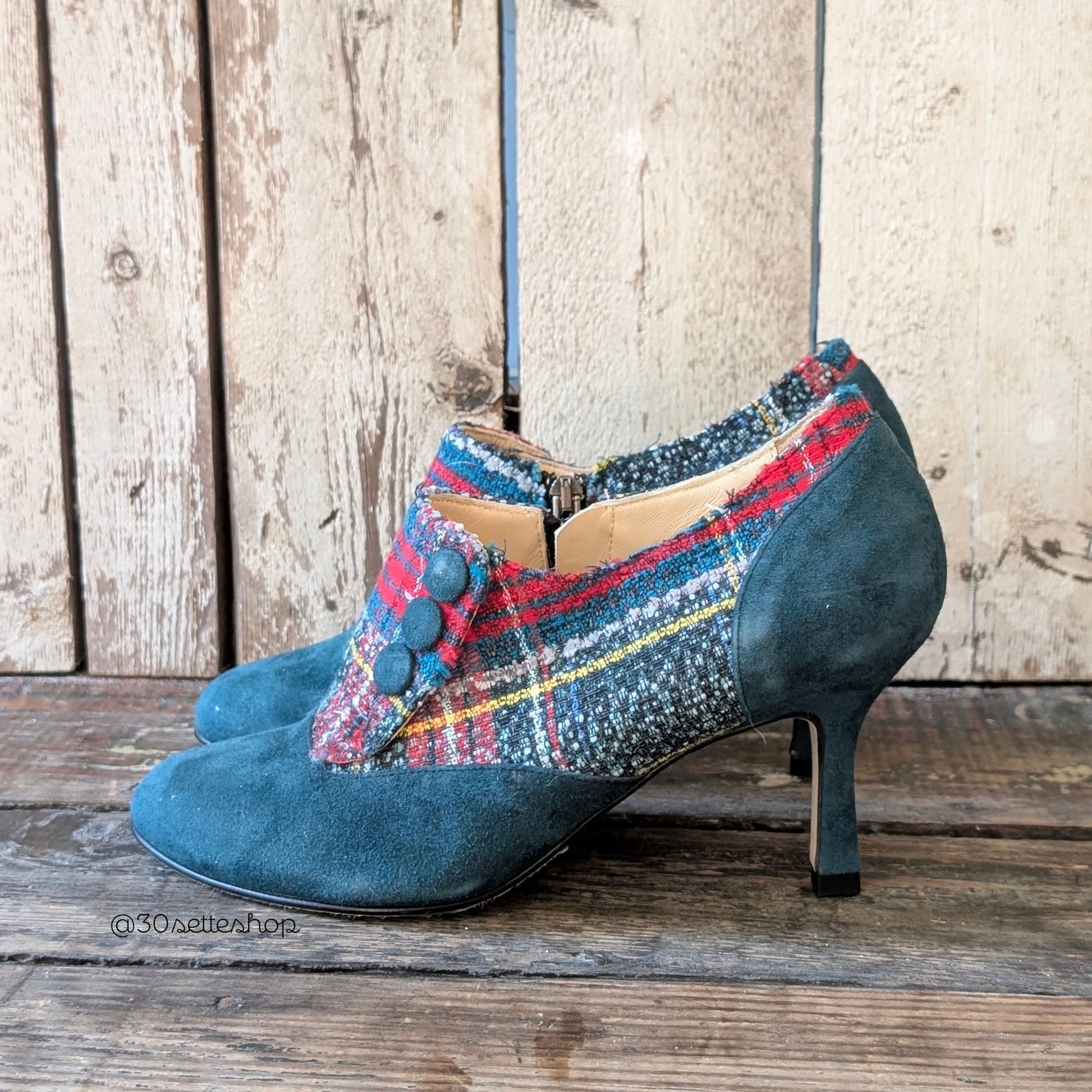 Scarpa da donna bimateriale con il tacco di media altezza realizzata artigianalmente a mano in tessuto bouclé multicolore a righe abbinato alla pelle scamosciata color ottanio.