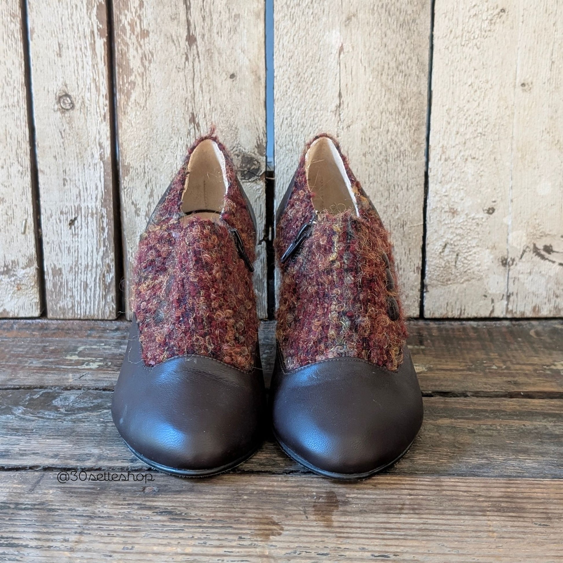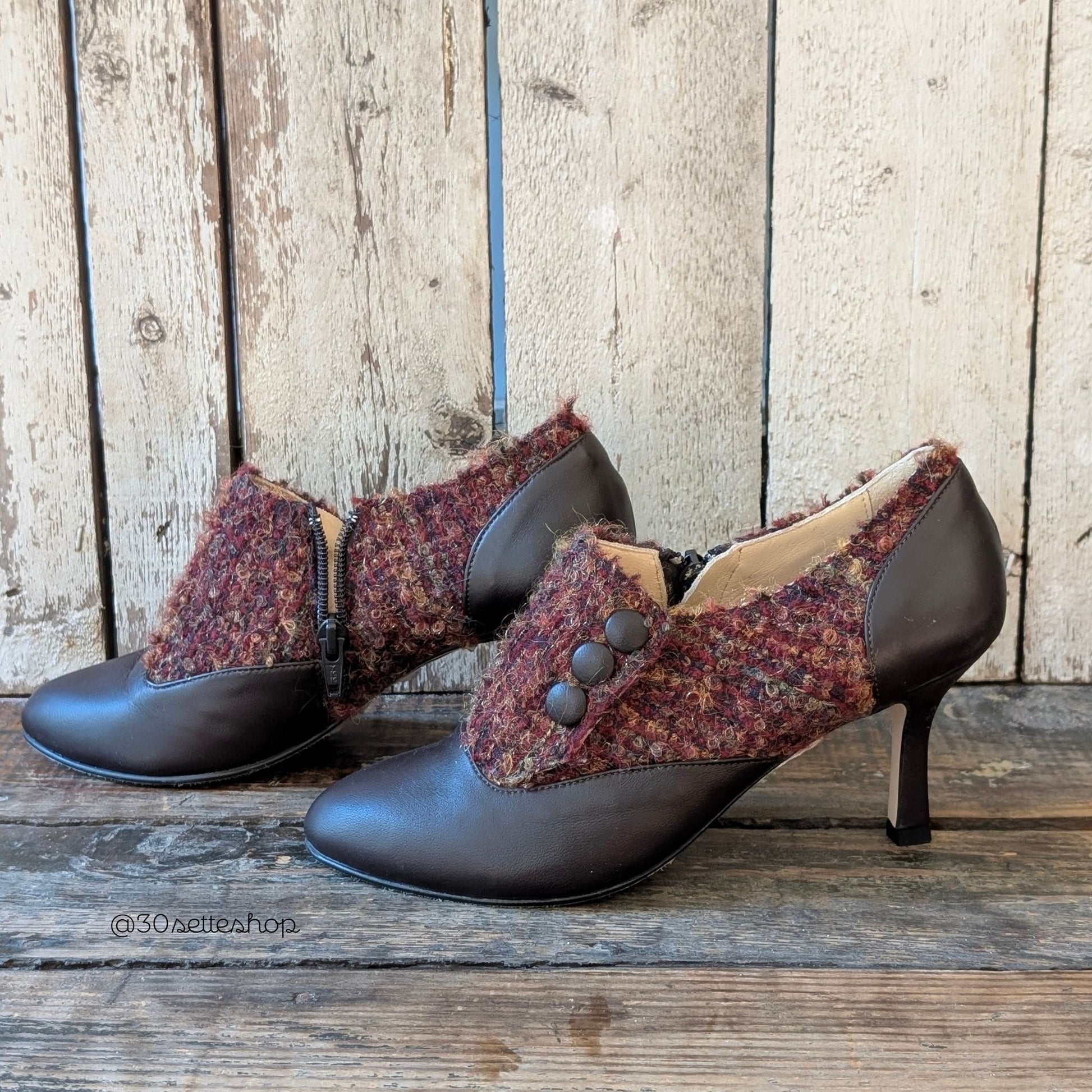 Scarpa da donna bimateriale con il tacco di media altezza realizzata artigianalmente a mano in tessuto bouclé base ruggine abbinato alla nappa testa di moro.