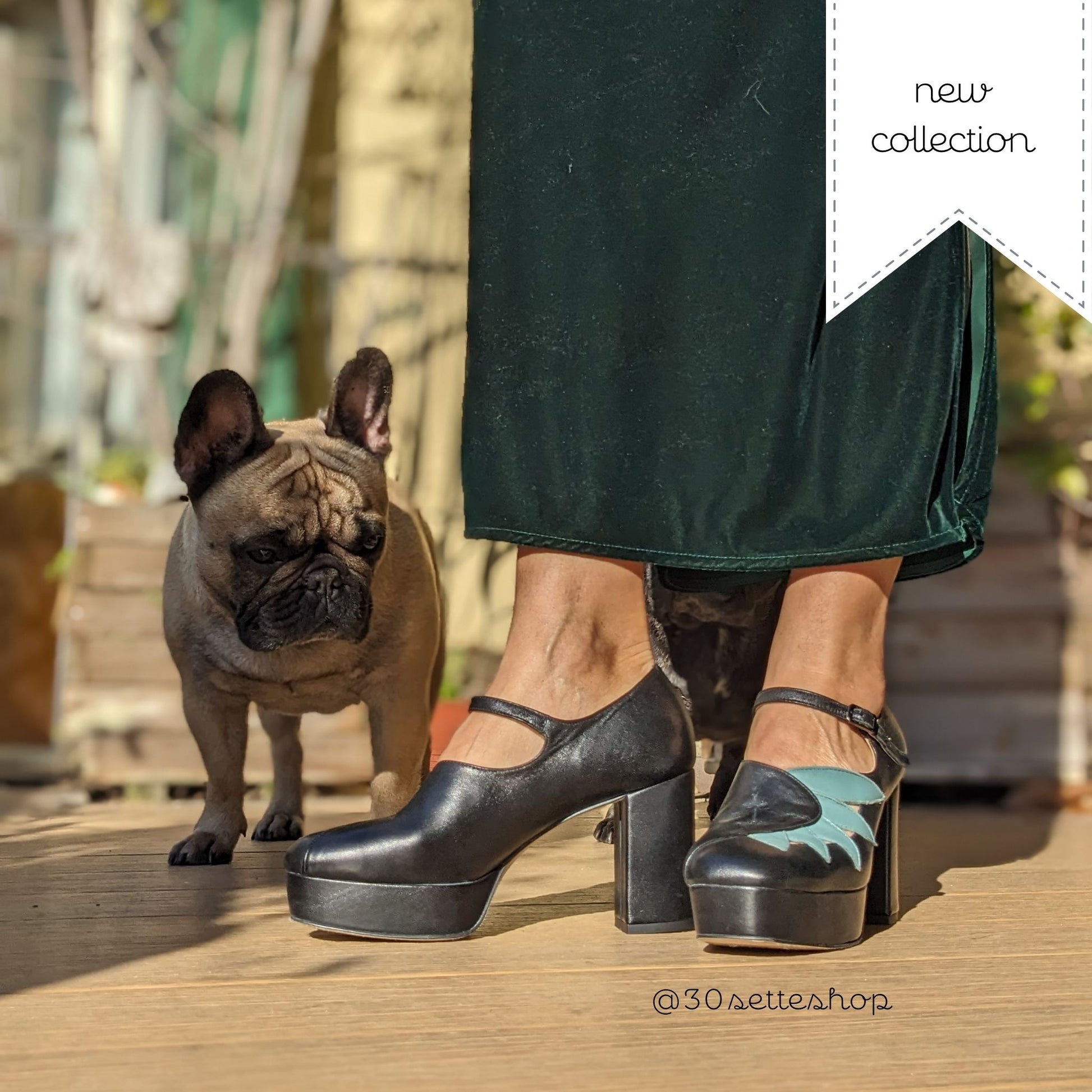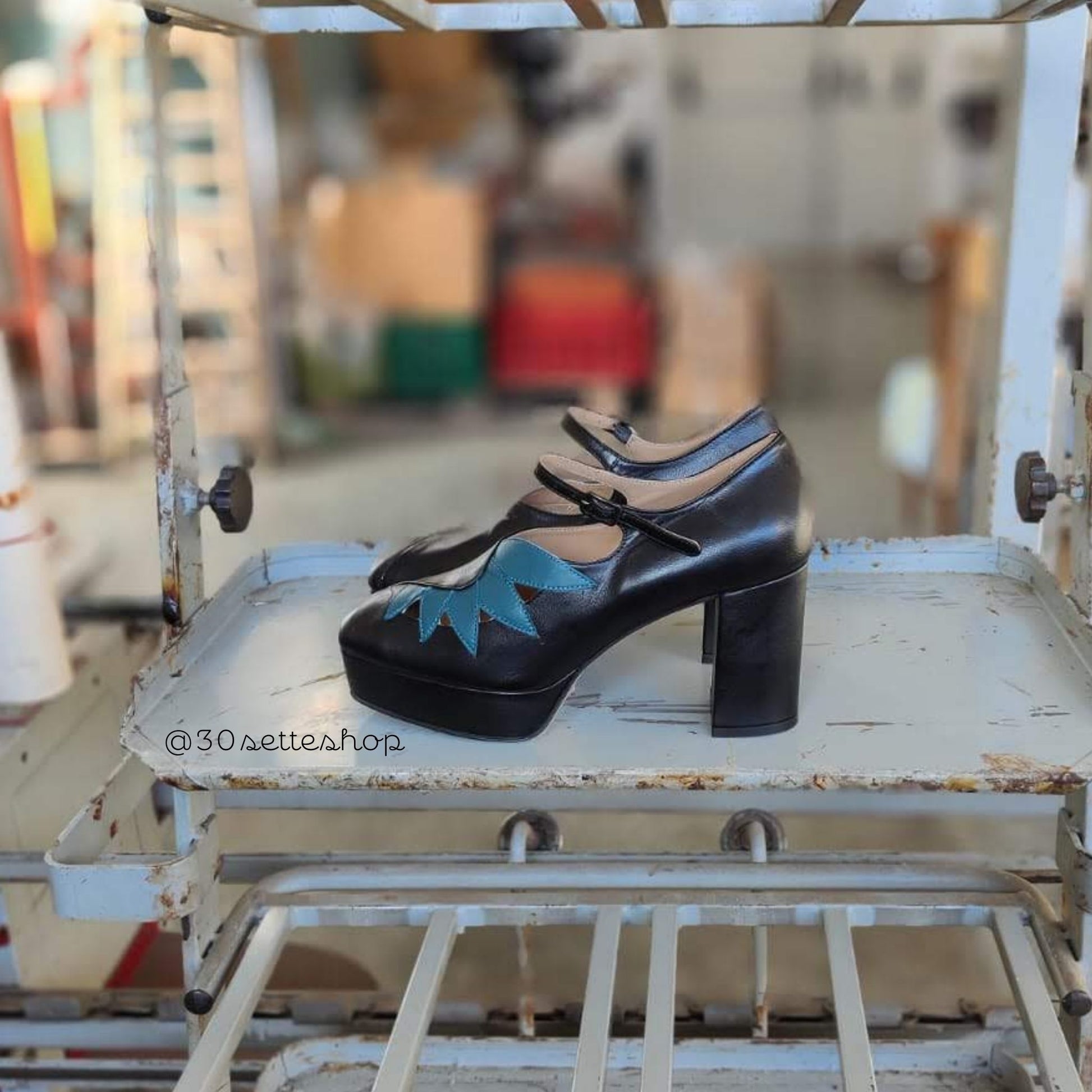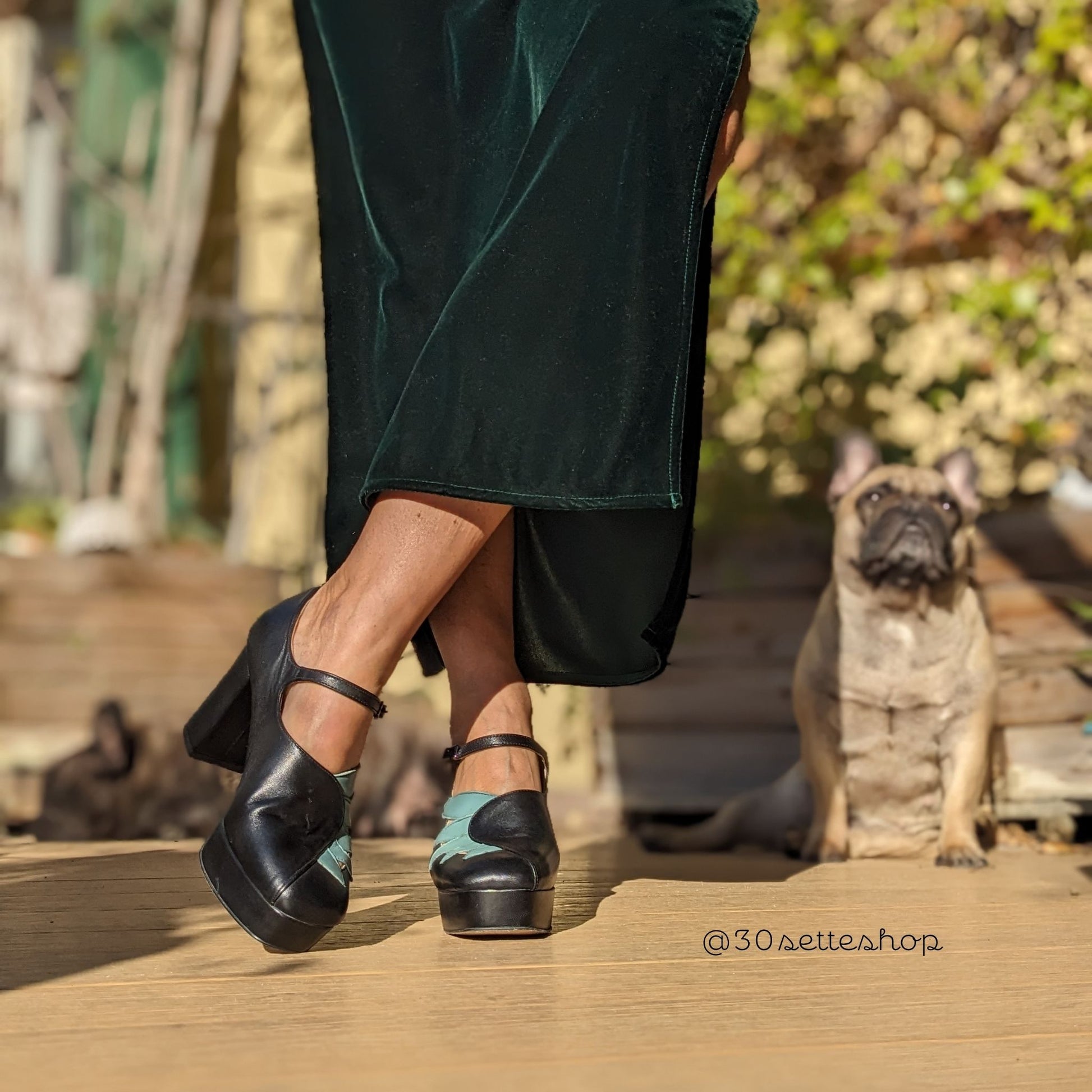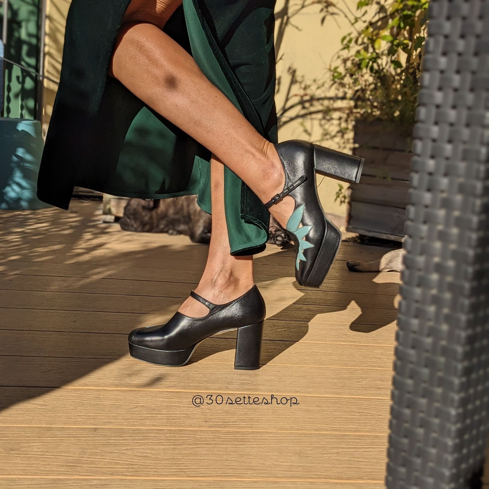 Décolleté Mary Jane dalla punta squadrata con tacco largo e plateau e decorazione a petali realizzata artigianalmente in morbidissima nappa nero abbinata alla nappa ottanio dei petali.