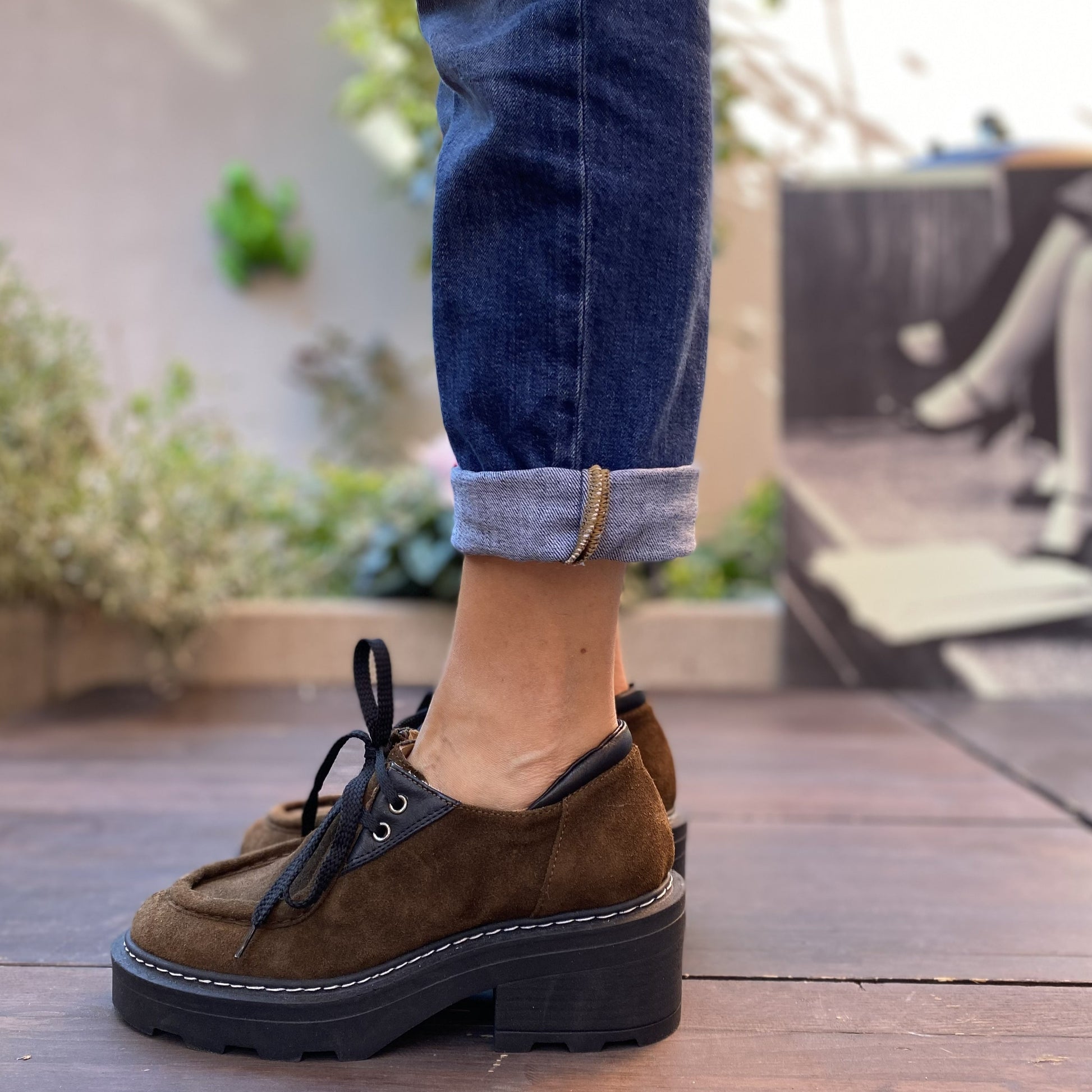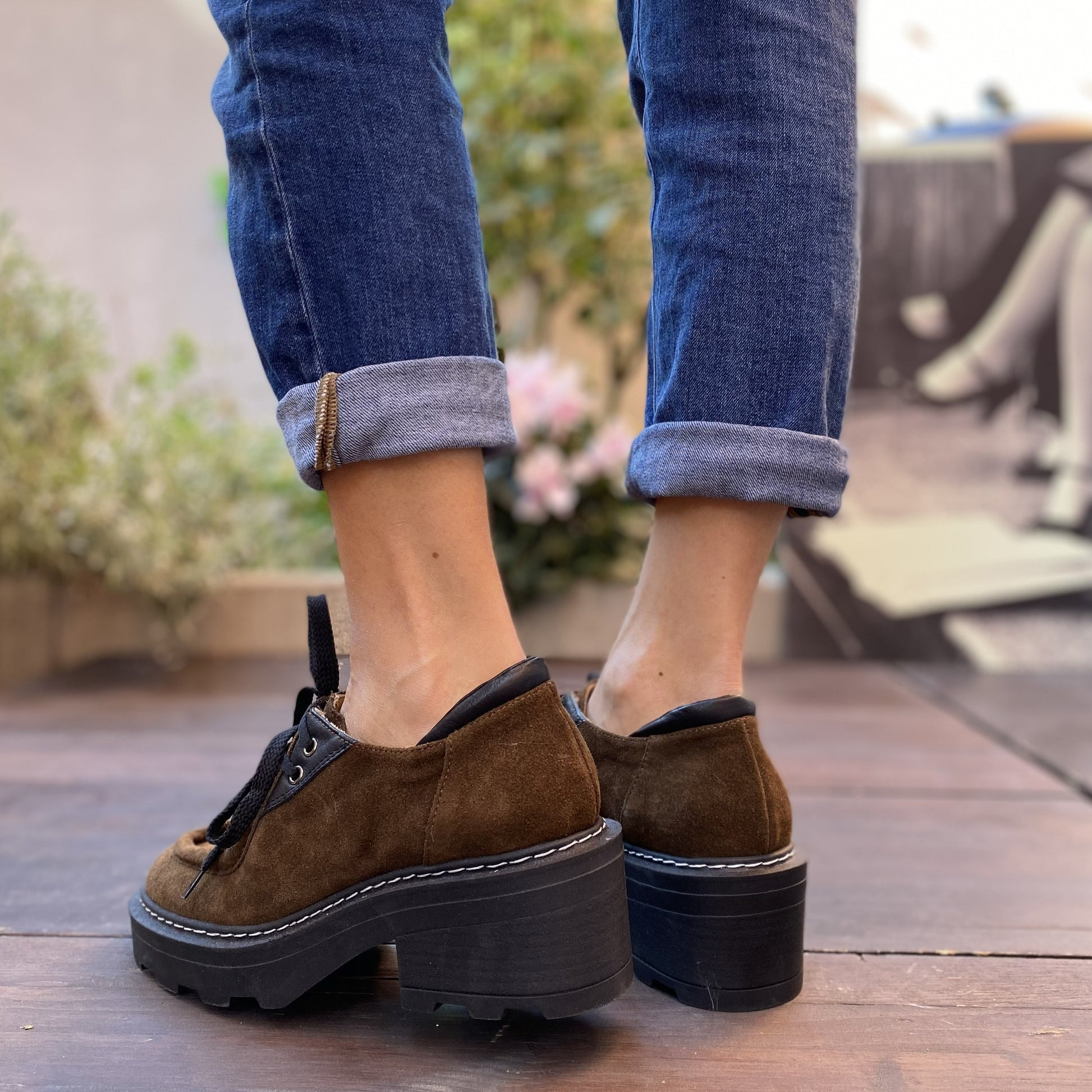Polacchino Moc Toe stringato con cuciture a vista, suola chunky e tacco realizzato artigianalmente a mano in pelle scamosciata marron scuro. Una nuance dai toni caldi che tanto ci ricorda l colore del sottobosco.