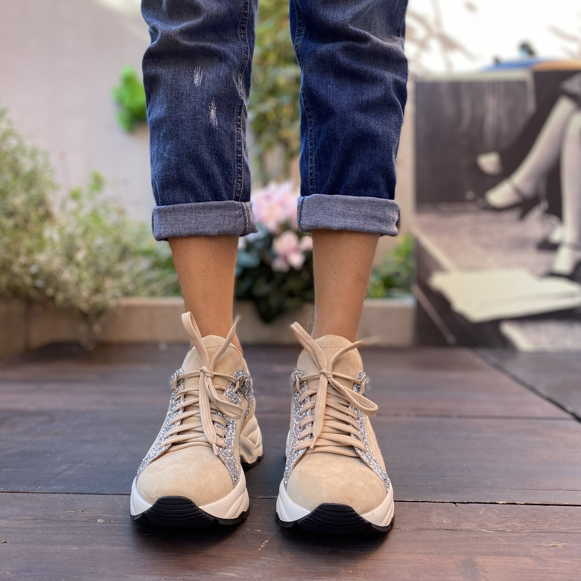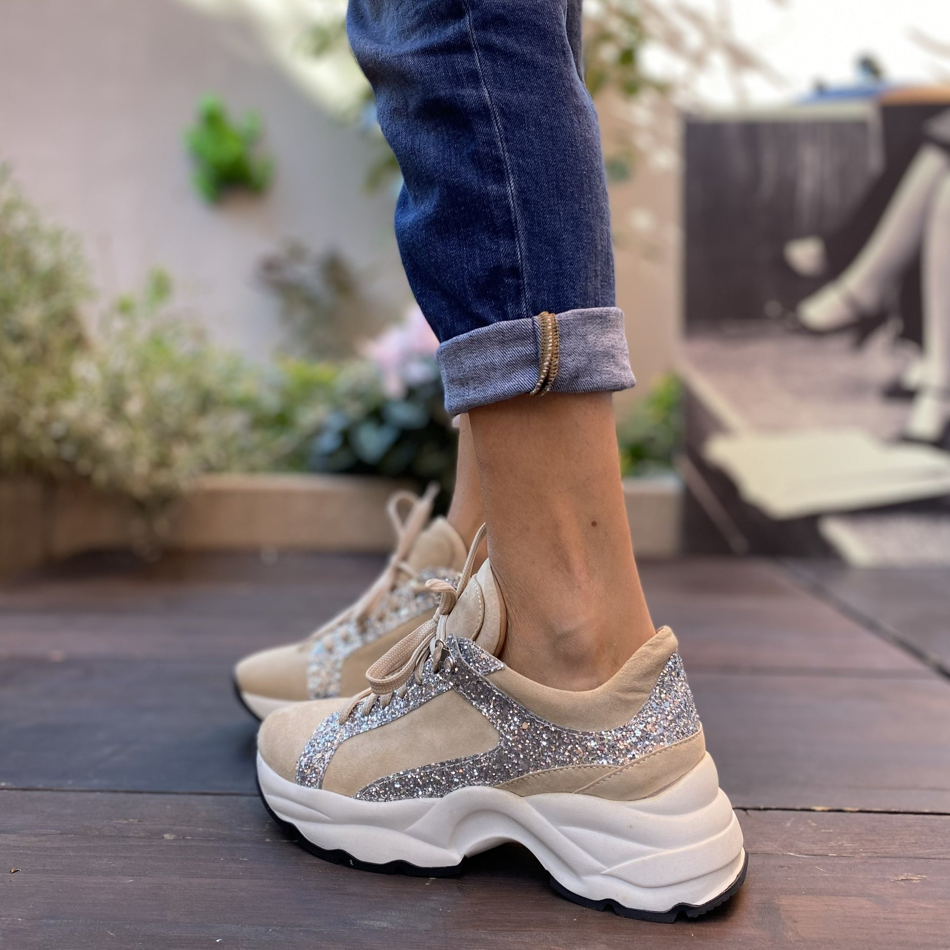 Sneakers da donna con lacci e maxi suola in camoscio sabbia con inserti in glitter argento.