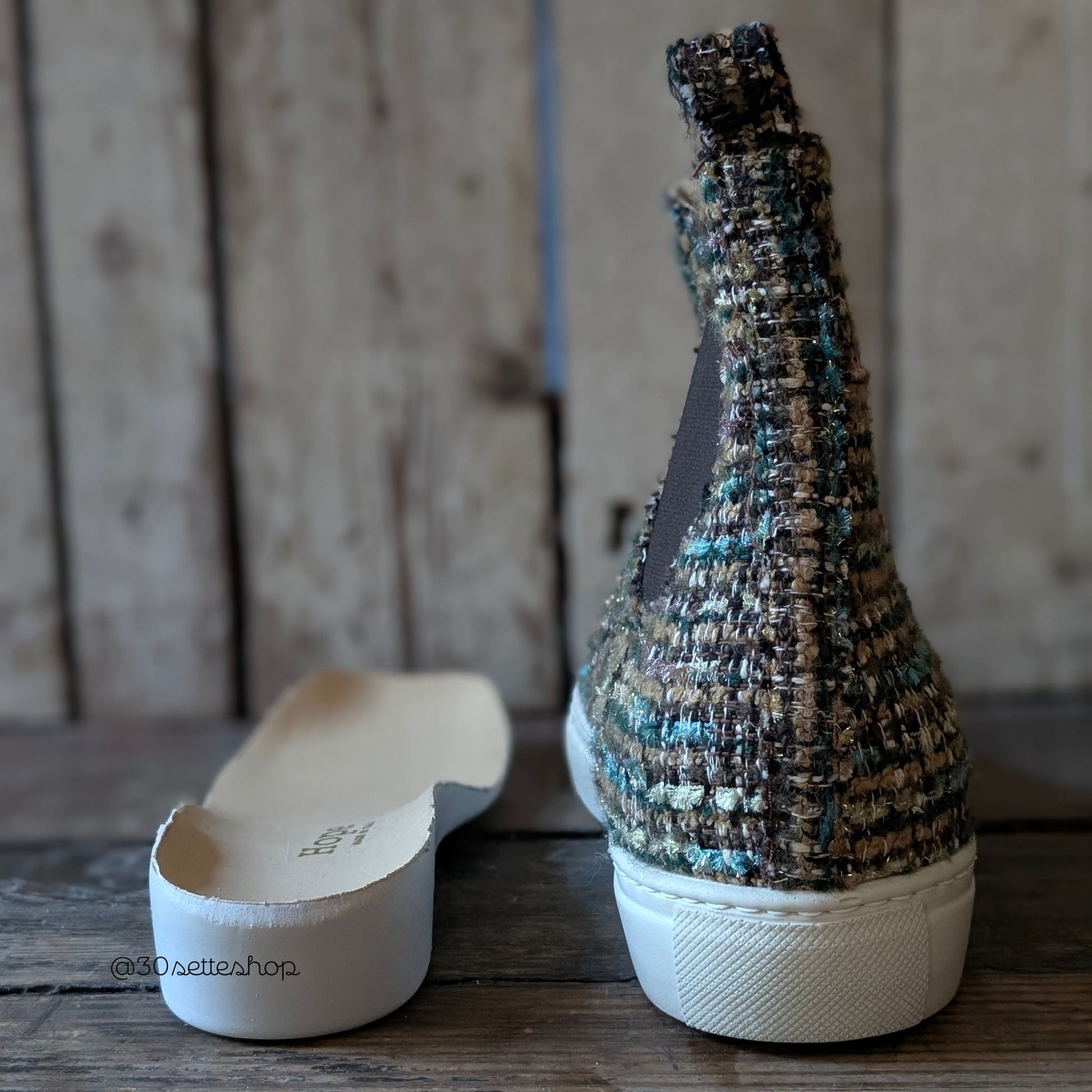 Sneaker stivaletto Beatles modello slip-on in un vivace tessuto agadir multicolore, dalla trama leggermente crespa.