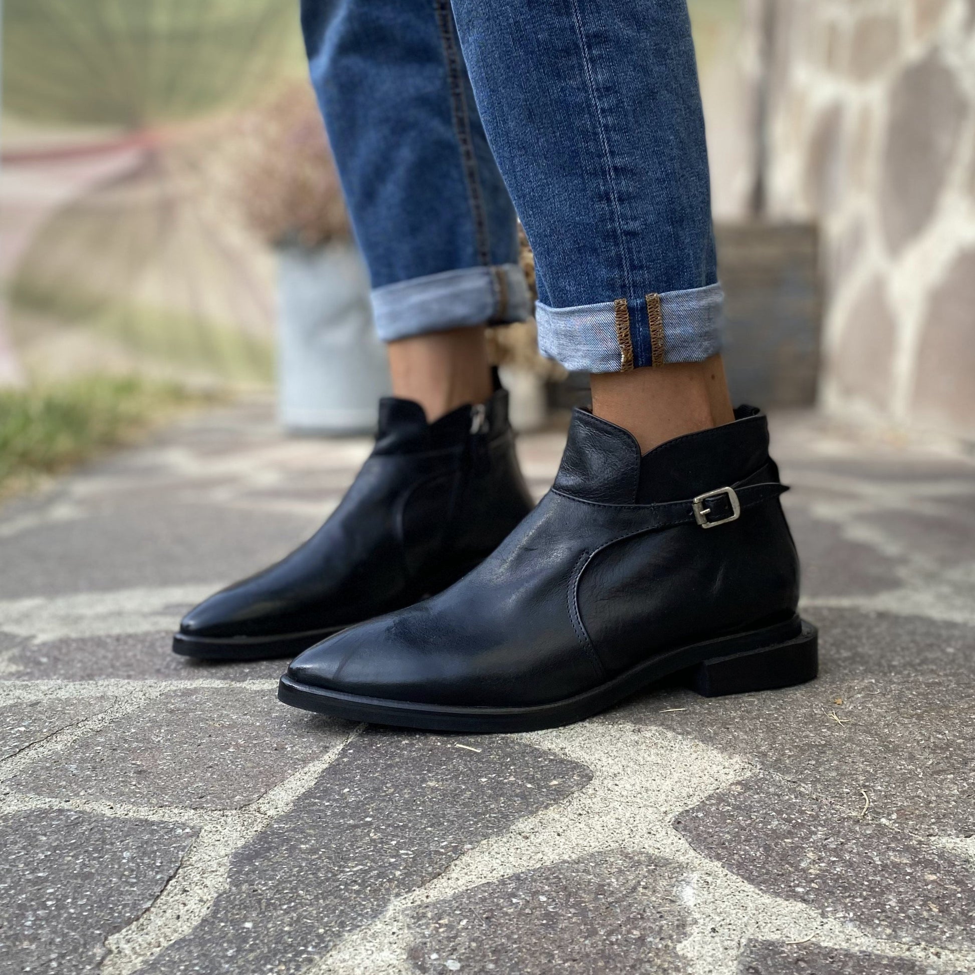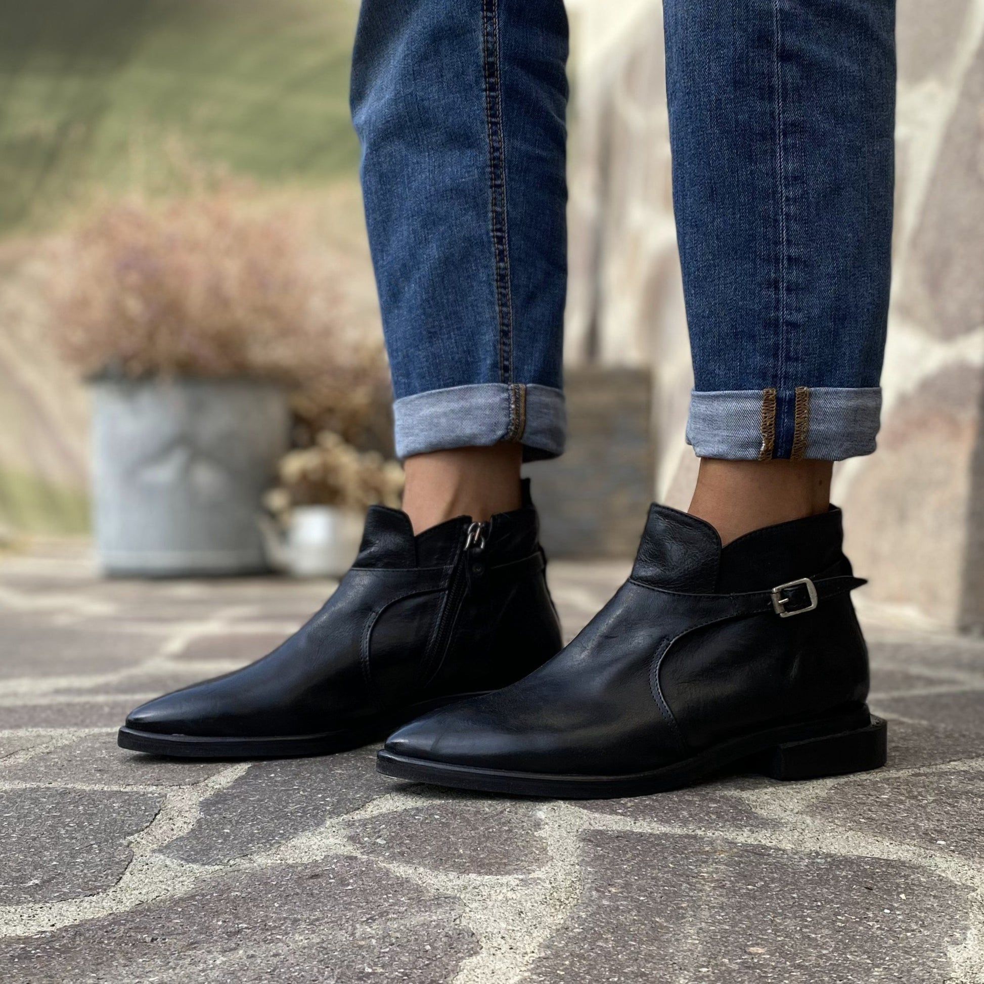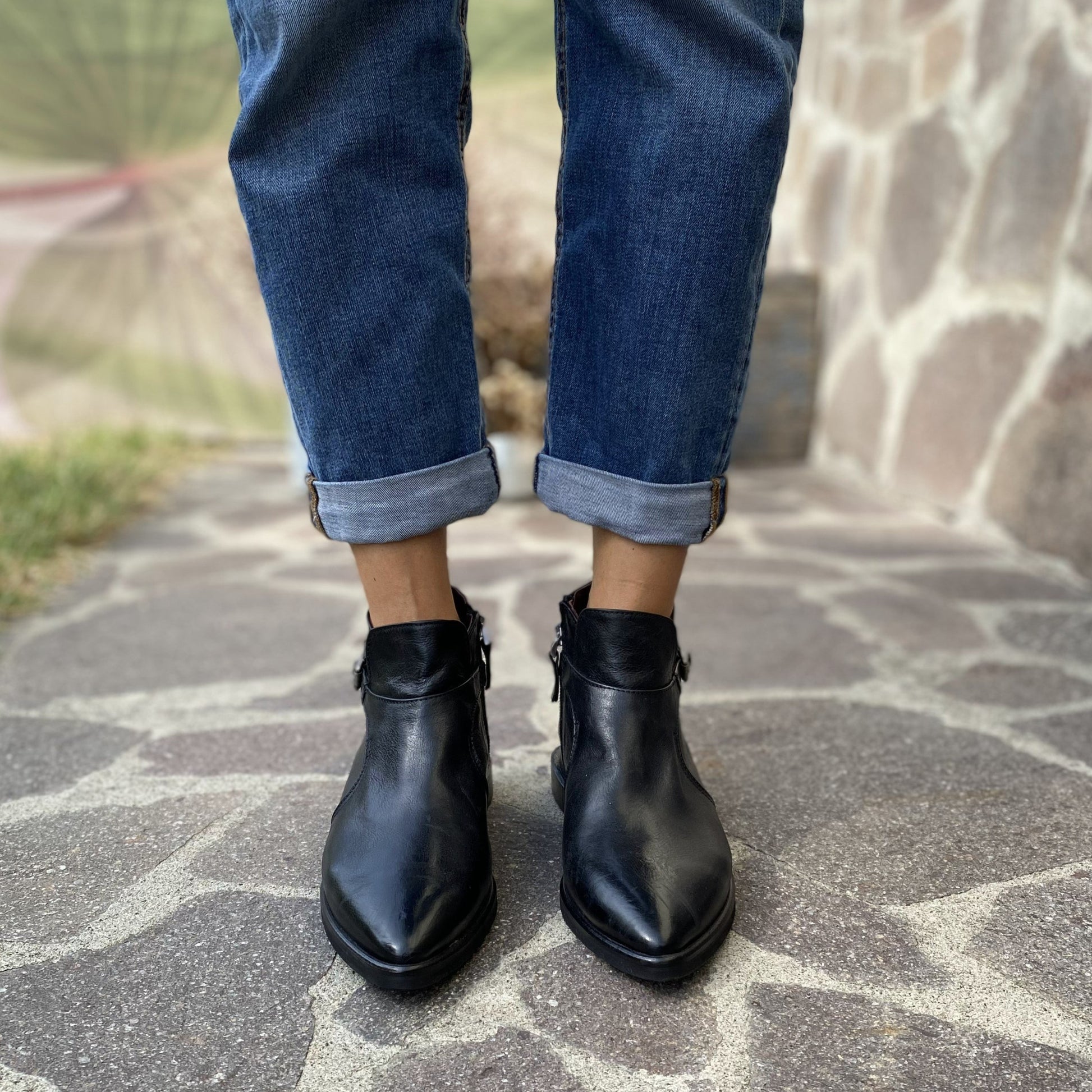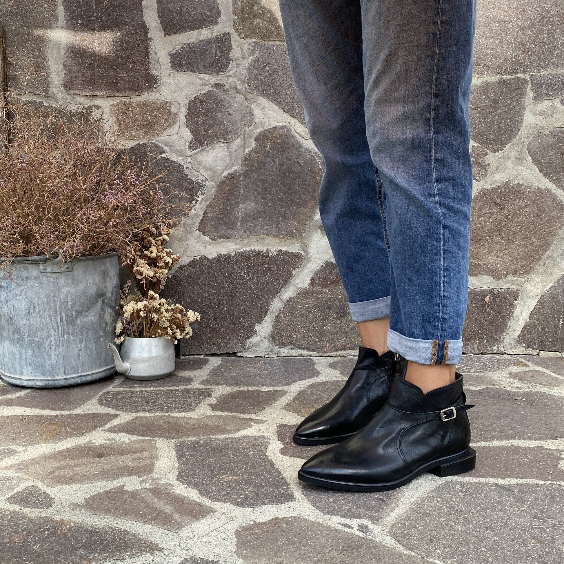STIVALETTI ALLA CAVIGLIA IN PELLE NERA CON FIBBIA , DALLE LINEE SEMPLICI MA ELEGANTI: UN VERO PASSE-PARTOUT IN TOTAL BLACK. LA TOMAIA LISCIA IN PELLE SPAZZOLATA DISPONE DI UNA COMODA FIBBIETTA E CINTURINO REGOLABILE CHE NE FACILITANO LA CALZATA. SILHOUETTE A PUNTA SFILATA E UN ORIGINALE TACCO QUADRATO DOVE SI INCASTRA LA TOMAIA.