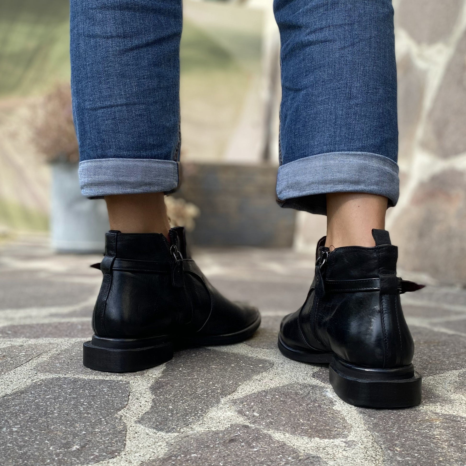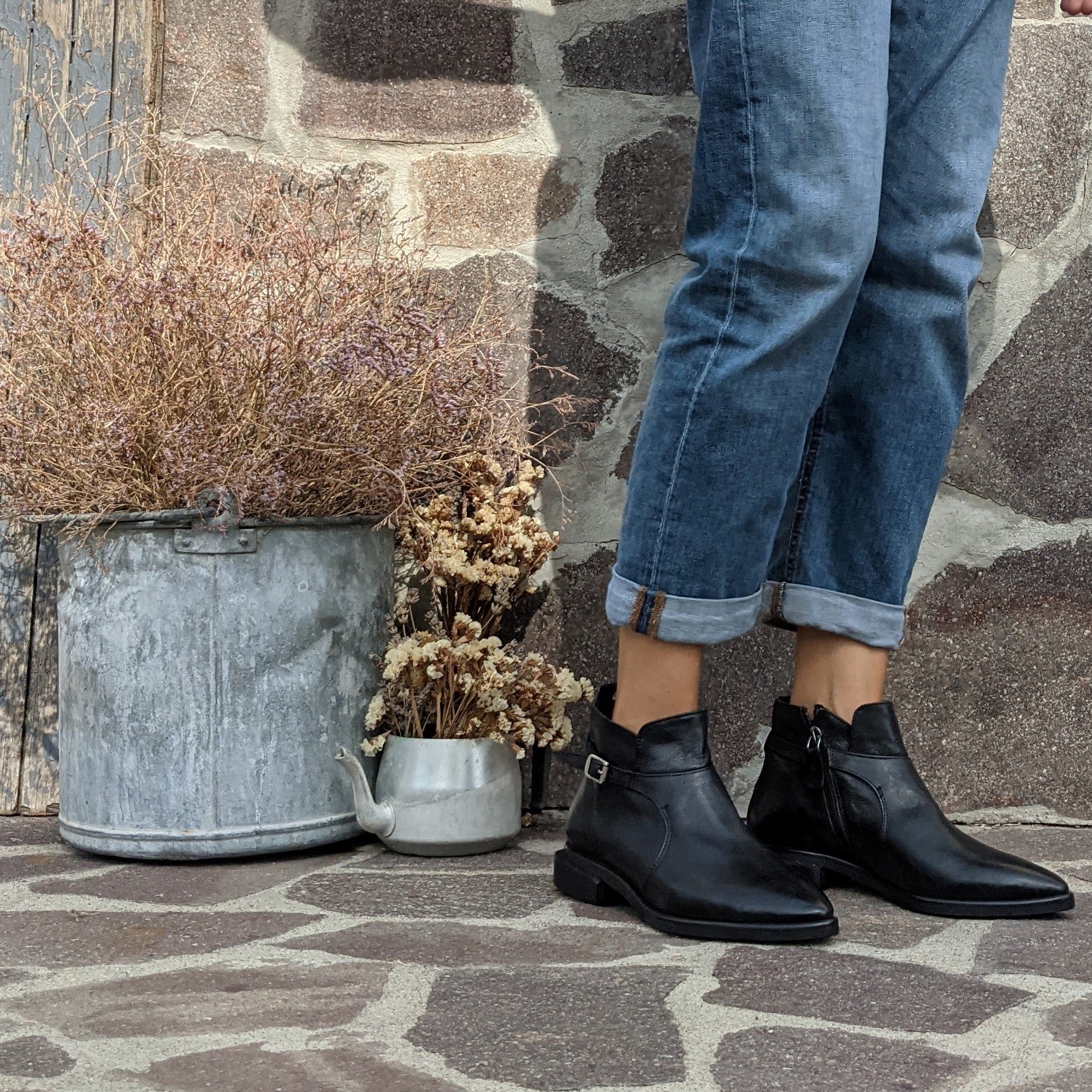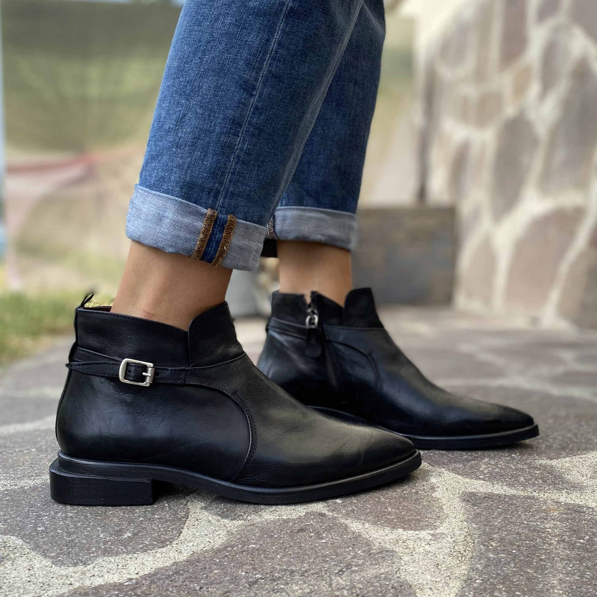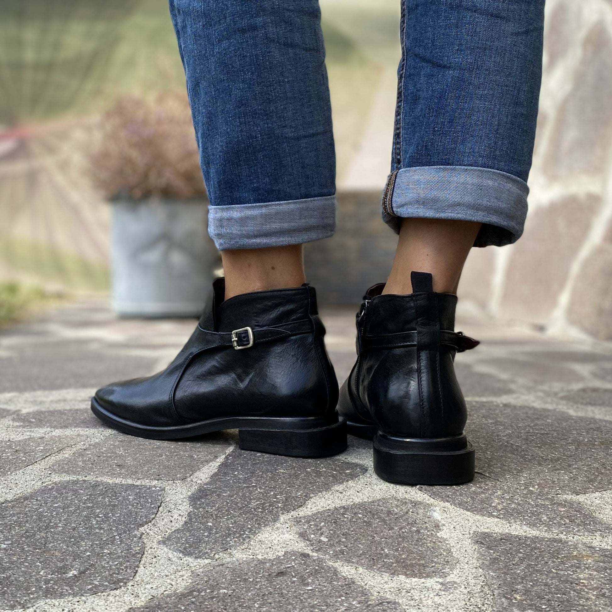 STIVALETTI ALLA CAVIGLIA IN PELLE NERA CON FIBBIA , DALLE LINEE SEMPLICI MA ELEGANTI: UN VERO PASSE-PARTOUT IN TOTAL BLACK. LA TOMAIA LISCIA IN PELLE SPAZZOLATA DISPONE DI UNA COMODA FIBBIETTA E CINTURINO REGOLABILE CHE NE FACILITANO LA CALZATA. SILHOUETTE A PUNTA SFILATA E UN ORIGINALE TACCO QUADRATO DOVE SI INCASTRA LA TOMAIA.