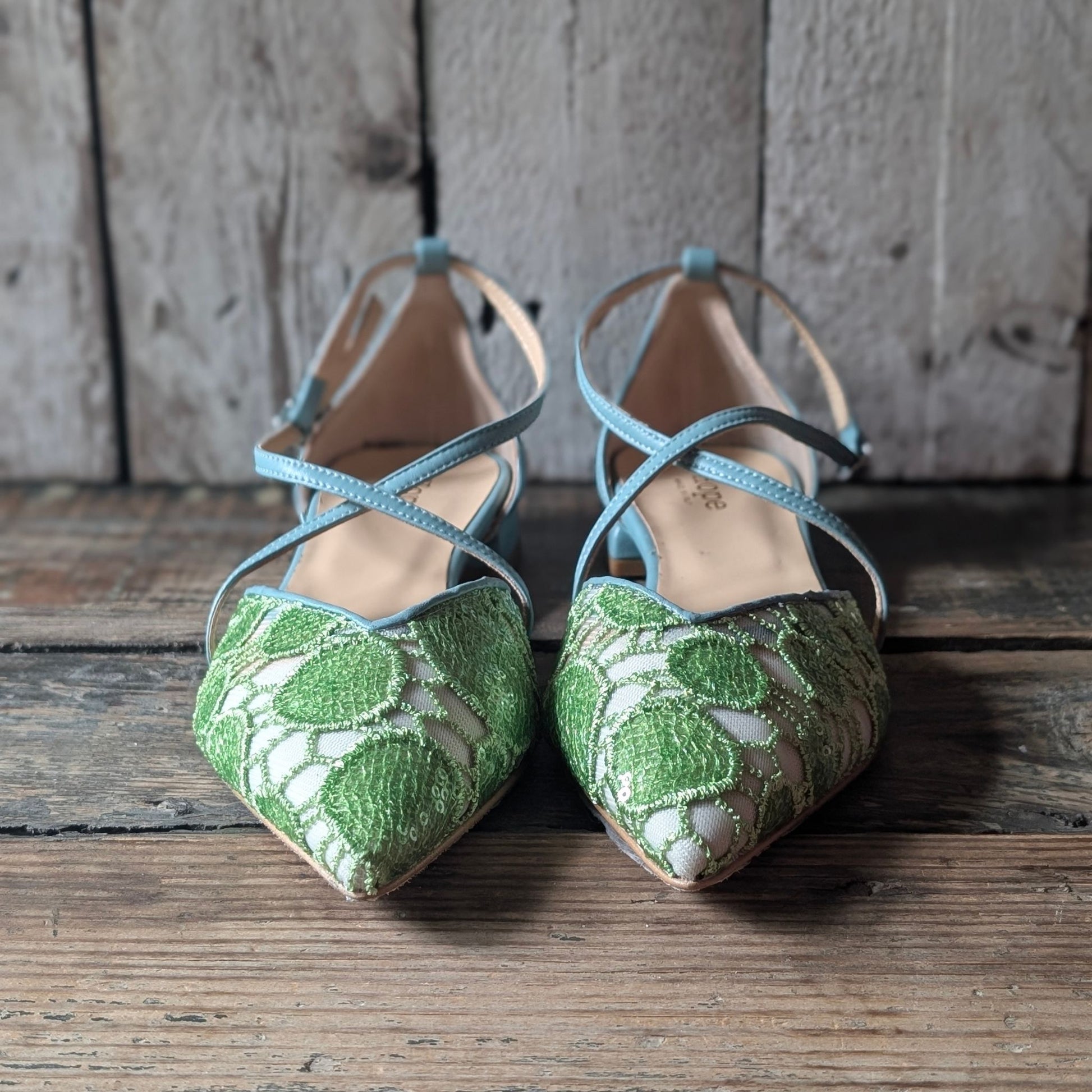 Vale ballerina a punta, con cinturini criss cross realizzata artigianalmente in tessuto ricamato a fiori in verde tenue abbinato a una nappa acqua.