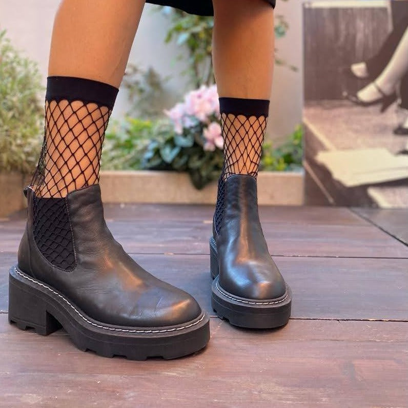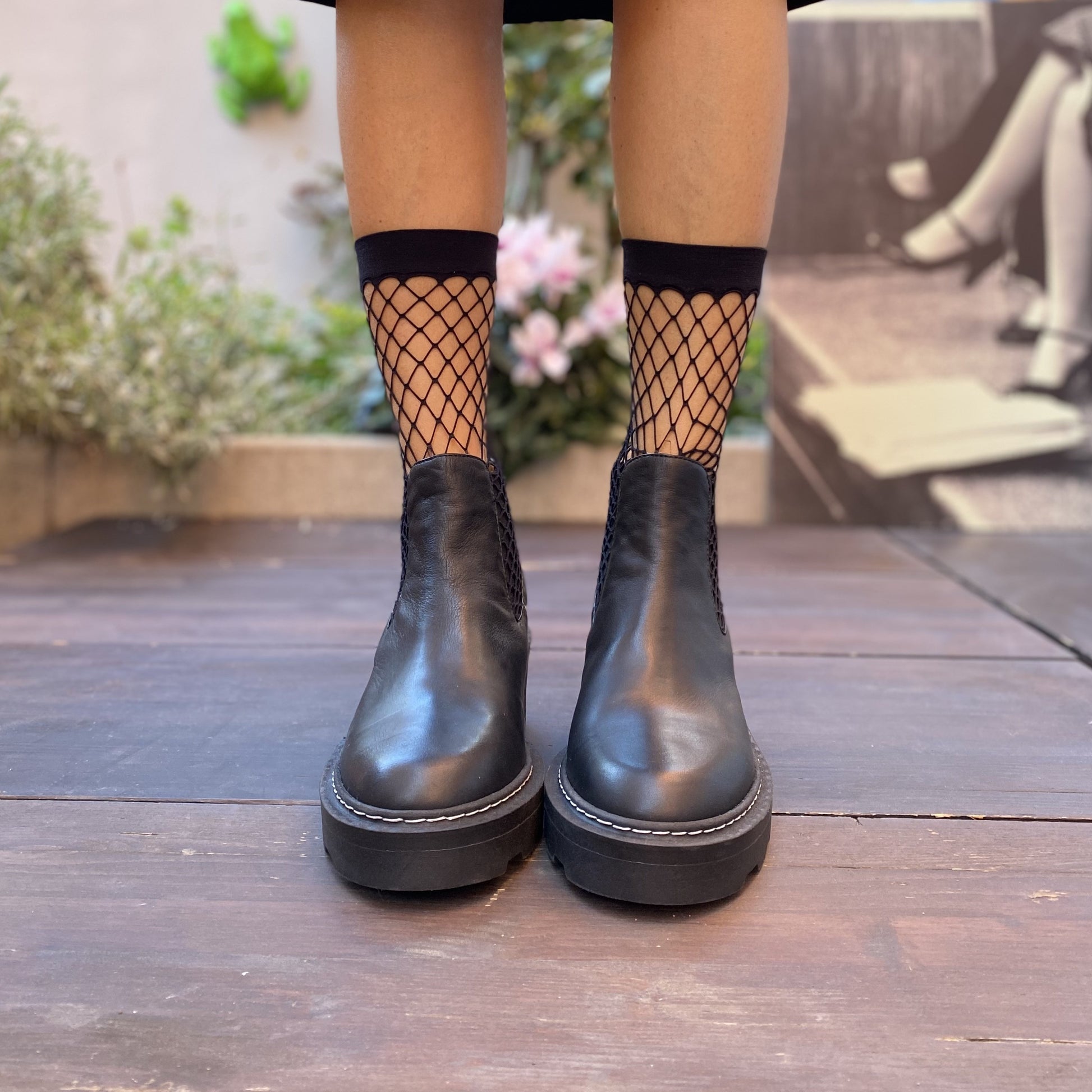 ABBIAMO REGALATO AL CLASSICO CHELSEA BOOTS, ESSENZIALE E PULITO UN LOOK ROCK E GRINTOSO. L’ELASTICO LATERALE, MARCHIO DI RICONOSCIMENTO DI QUESTI STIVALETTI, È STATO RIDISEGNATO E COPERTO CON UNA CALZA DI RETE CHE SALE OLTRE LA CAVIGLIA. L’ALLURE BON TON DA RAGAZZA "PREPPY" SI ARRICCHISCE DI DETTAGLI PUNK.