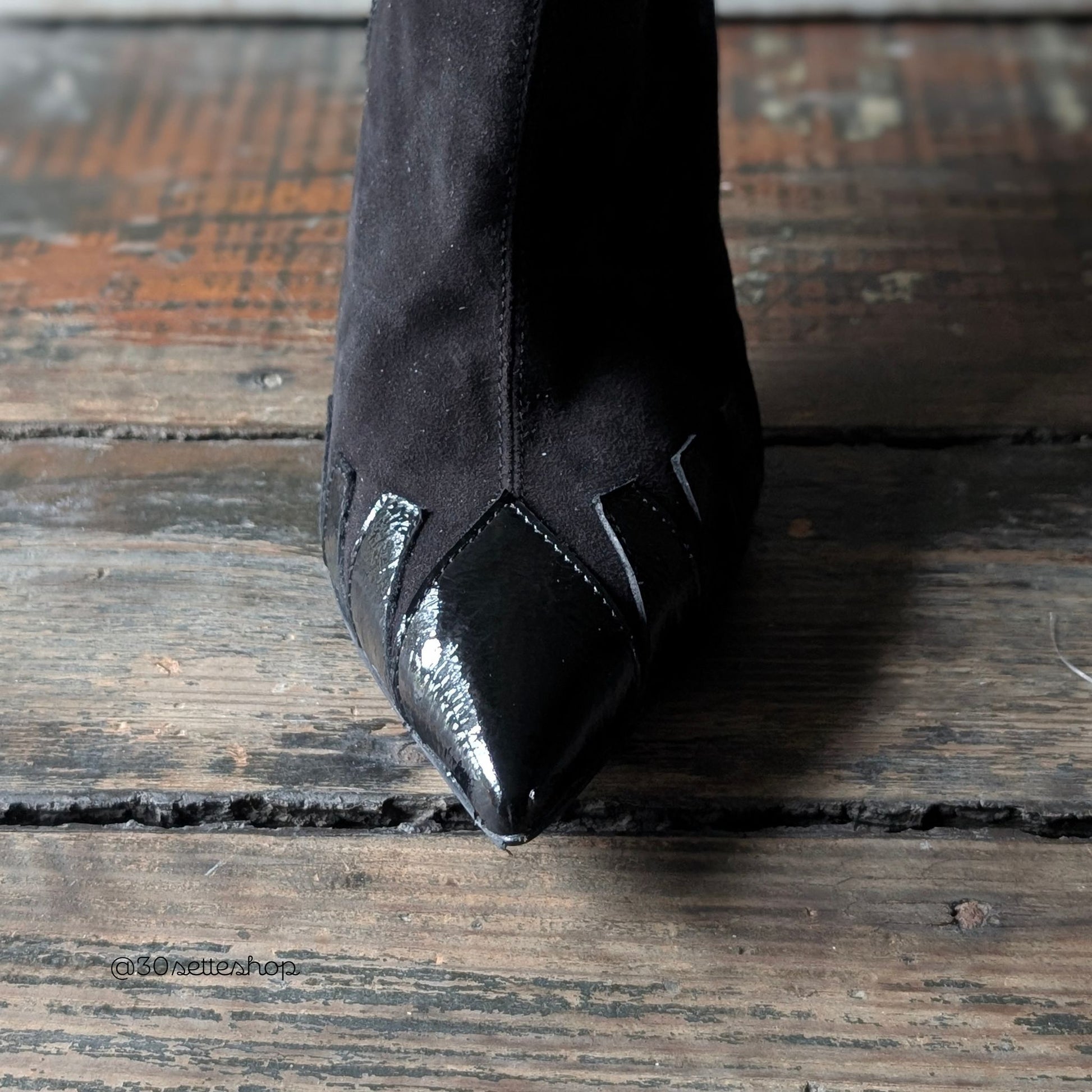 Virginia è uno stivaletto Kitten Heels a punta realizzato artigianalmente a mano in morbida pelle scamosciata nero e intarsi in punta in naplak nero.